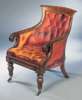 possibly Scottish, the curved scroll over back and arms with charged scrolling terminals enclosing morocco button upholstered base on baluster turned legs terminating in brass caps and castors