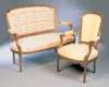 of Louis XVI style, comprising a canape, enclosed by flower and ribbon tied carved frame with shaped upholstered back, seat and open arms, raised on turned and fluted leaf carved legs, 130cm wide; and two fauteuils en suite (3)
