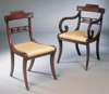 including two carvers, each with curved entablature top rails, the scrolled surmounts with reeded decoration, above a mid rail pierced and carved with rosette and opposing thistles, the drop-in seat raised above sabre legs (8)