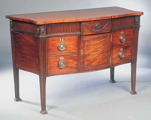 possibly adapted from a side table, the shaped and hinged top opening to reveal a fitted interior, above a fluted frieze with central panel applied with oval leaf carved patera and leaf swag over a panelled door, flanked by two deep drawers, enclosing divided interiors and with dummy drawer fronts, raised above deeply fluted square tapering legs terminating in block feet
