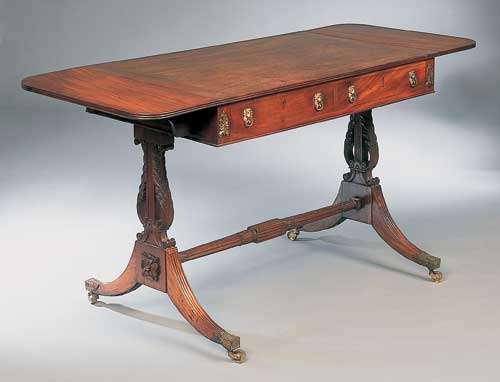 the rectangular top with rounded angles and reeded edge above a pair of frieze drawers opposing false drawers on pierced leaf carved lyre supports and reeded sabre legs joined by carved and reeded stretchers
