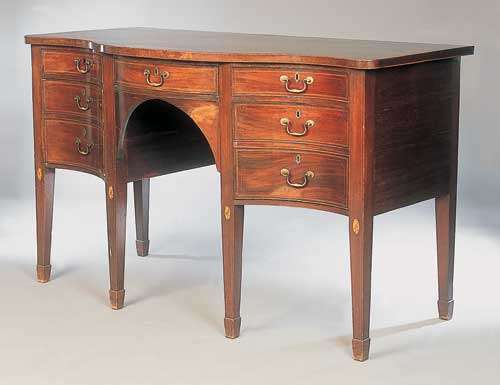 with chequer stringing, the shaped top above a central drawer flanked by two short and two long deep drawers raised on square section tapering legs inlaid with shell paterae and terminating in spade feet