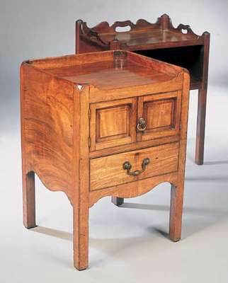 the shaped galleried top with cut out carrying handles above an open shelf, raised on square section chamfered legs (adapted)