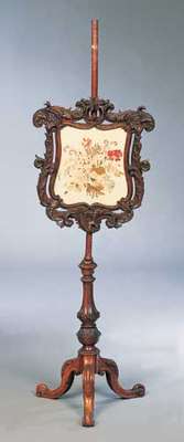 the elaborately scrolling rectangular frame supported on a turned column on triform base with leaf carved cabriole legs