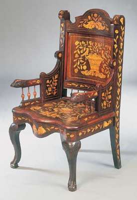 profusely inlaid with flowers and birds, the panelled bowed and arched back with projecting uprights and pierced balustrade at base, the arms with similar balustrade and serpent head terminals, above serpentine seat and shaped apron with carved cabriole legs on ball and claw feet