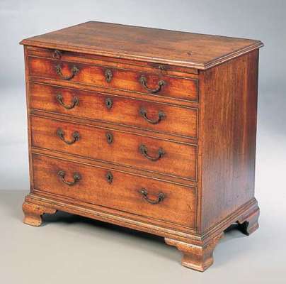 the rectangular top with moulded edge above brushing slide and four graduated drawers on ogee bracket feet