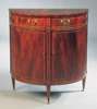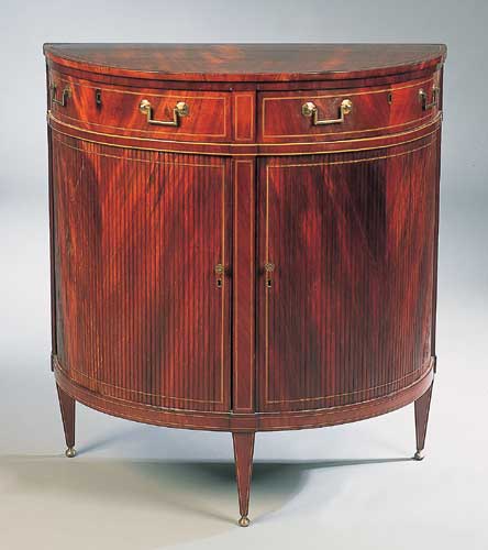 with boxwood and ebony stringing, the top with matched veneers, above a pair of hinged frieze drawers, and corresponding tambour doors below enclosing single space with velvet lined shelves, the whole raised on sharply tapering square section legs with brass bun feet