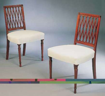 each with square lattice back with corner rosette paterae, above stuffover seat on turned tapering front legs (recently restored and prepared for final upholstery) (1)