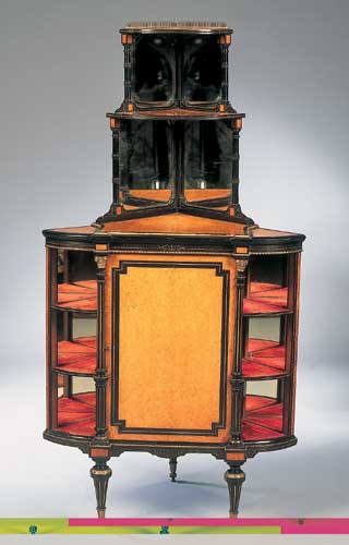 the surmount with two mirror backed open shelves, supported by gilt incised turned columns, the stepped and shaped top above a central panel door flanked by velvet covered and mirror backed open shelves, raised on turned tapering legs, gilt brass mounts