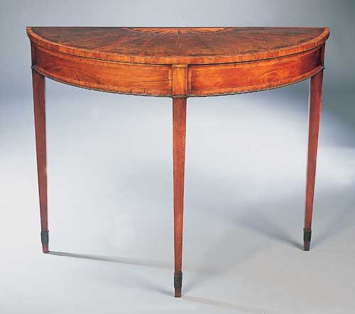 A George III mahogany and satinwood demilune sidetable