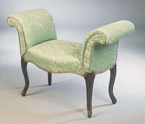 the serpentine upholstered seat enclosed with button scroll over arms, raised on moulded cabriole legs, carved with shell and husk pendants to the knees, and terminating in scroll toes
