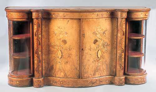 with foliate marquetry decoration, the shaped burr walnut veneered top with moulded edge above a pair of doors with ribbon tied trophy marquetry panels, enclosing adjustable shelves, flanked by engaged columns, drum shaped glazed doors enclosing velvet lined shelves, raised on corresponding inlaid plinth