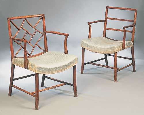 one with altered back, the other with typical Chinoiserie lattice above hollow upholstered seat and curved open arms raised on cluster column curved front legs linked by stretchers (2)