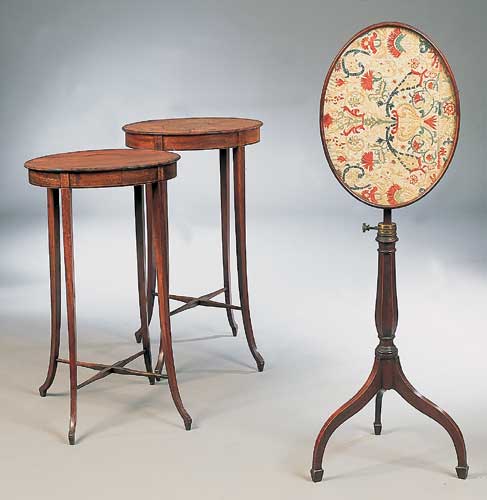 each with moulded top and plain frieze above splayed square section tapering legs joined by cross stretcher