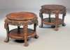 each with lobed circular tops relief carved with a band of peony and with beaded edge, above an elaborate pierced and carved frieze raised on leaf carved cabriole legs linked by a lower tier and terminating in claw and ball feet (2)