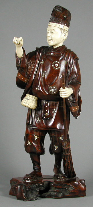 with oval pointed hat, and tunic with applied ivory and mother of pearl mon decoration, similar loose pantalons with a small creel at his waist and holding a broom, on naturalistic plinth, signed on red inset tablet