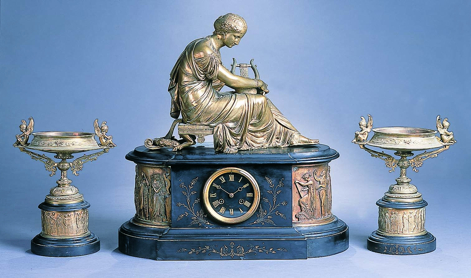 A 19th century black slate and brass clock garniture