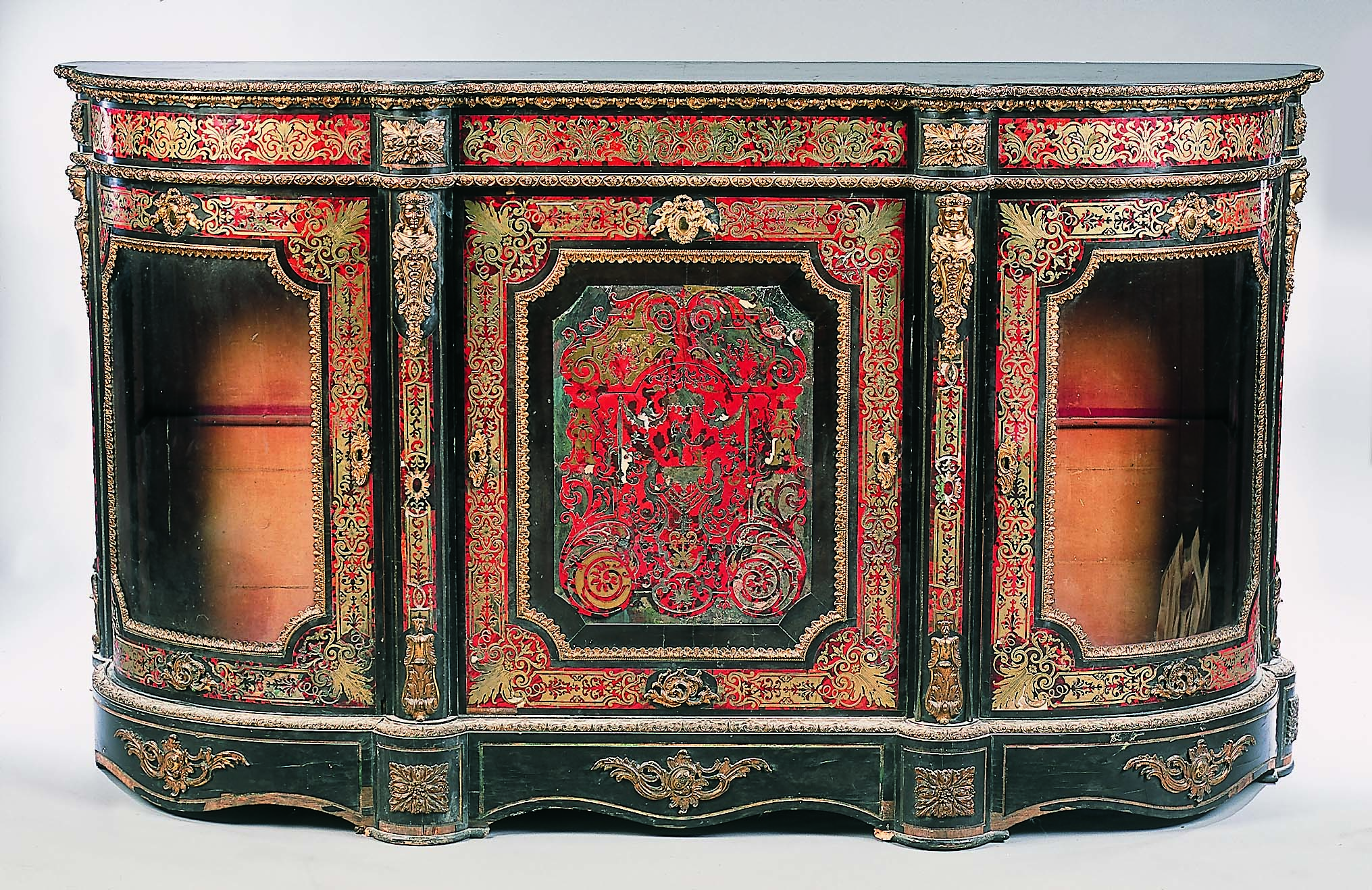 with gilt brass mounts, the shaped top above frieze and central door flanked by glazed quadrant doors divided by half columns with figural capitals, on plinth base with shaped apron
