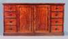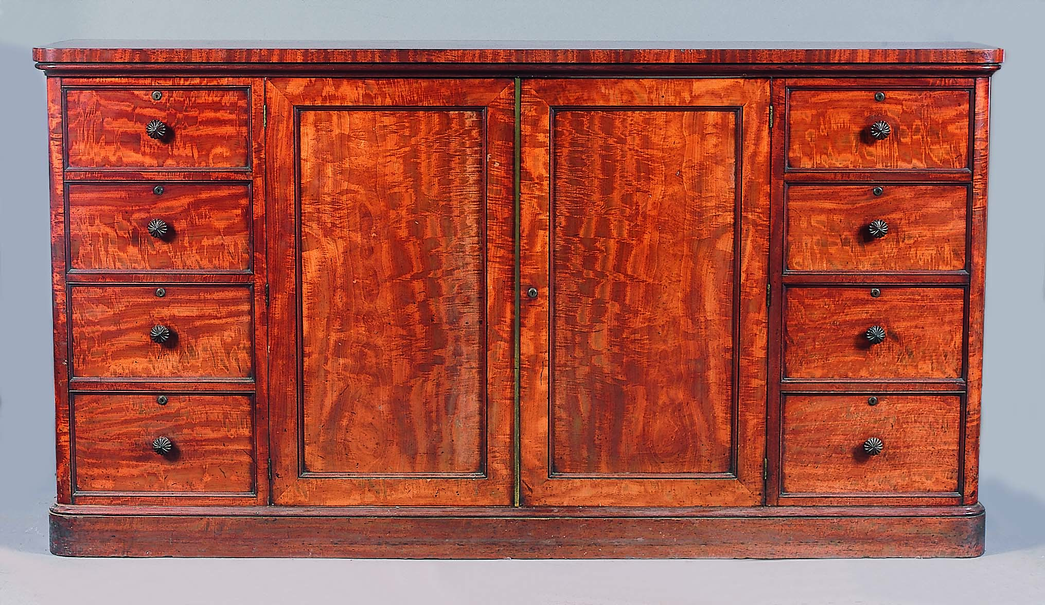 the rectangular top with deep crossbanded and moulded edge and rounded angles above pair of panelled doors enclosing sliding trays, flanked by banks of four graduated drawers with moulded oakbeading and gadrooned handles, on plinth base