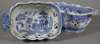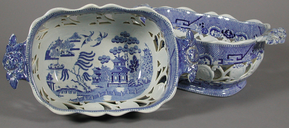 decorated in the Willow pattern, deep cellular frieze, shaped flowerhead cast twin handles, flowerhead cast pierced frieze (2)