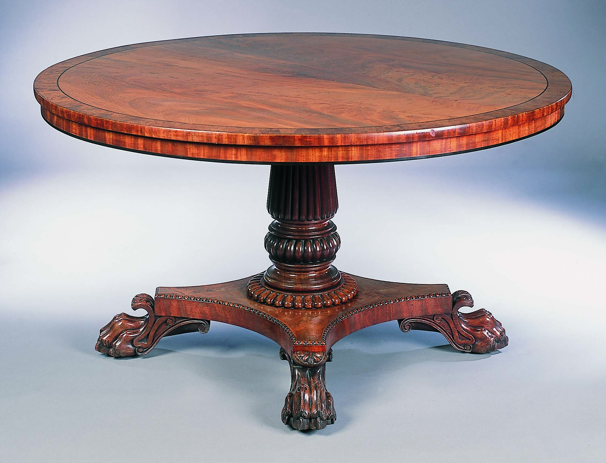 the circular tilt top with burr oak banding raised on bold reeded and turned pedestal and concave quadriform base with bead and reel moulding and carved paw feet with castors