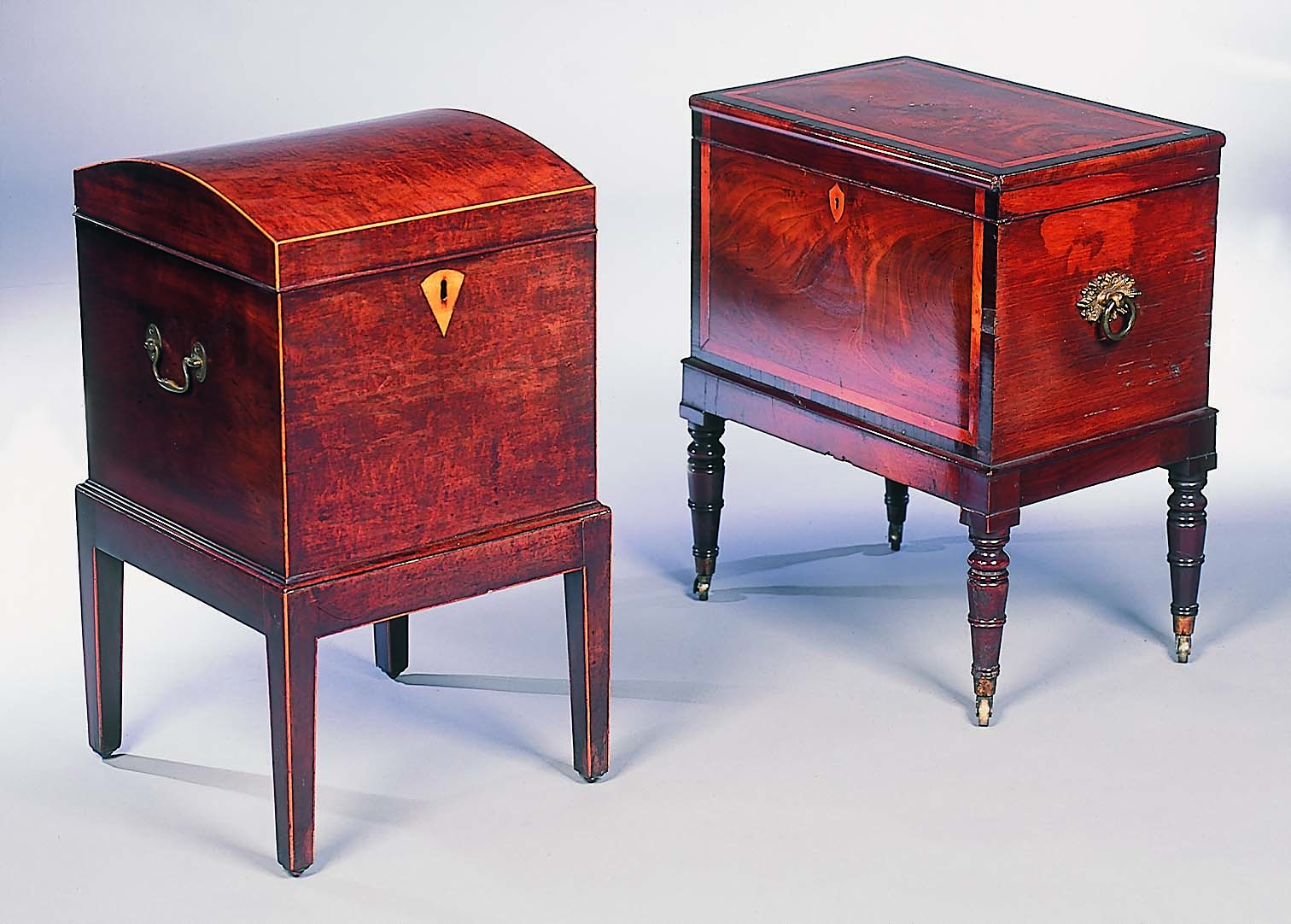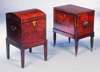 the hinged rectangular top with satinwood and rosewood crossbanding and cushion moulded edge, enclosing divided interior, above corresponding body and plinth on ring turned tapering legs with brass caps and castors