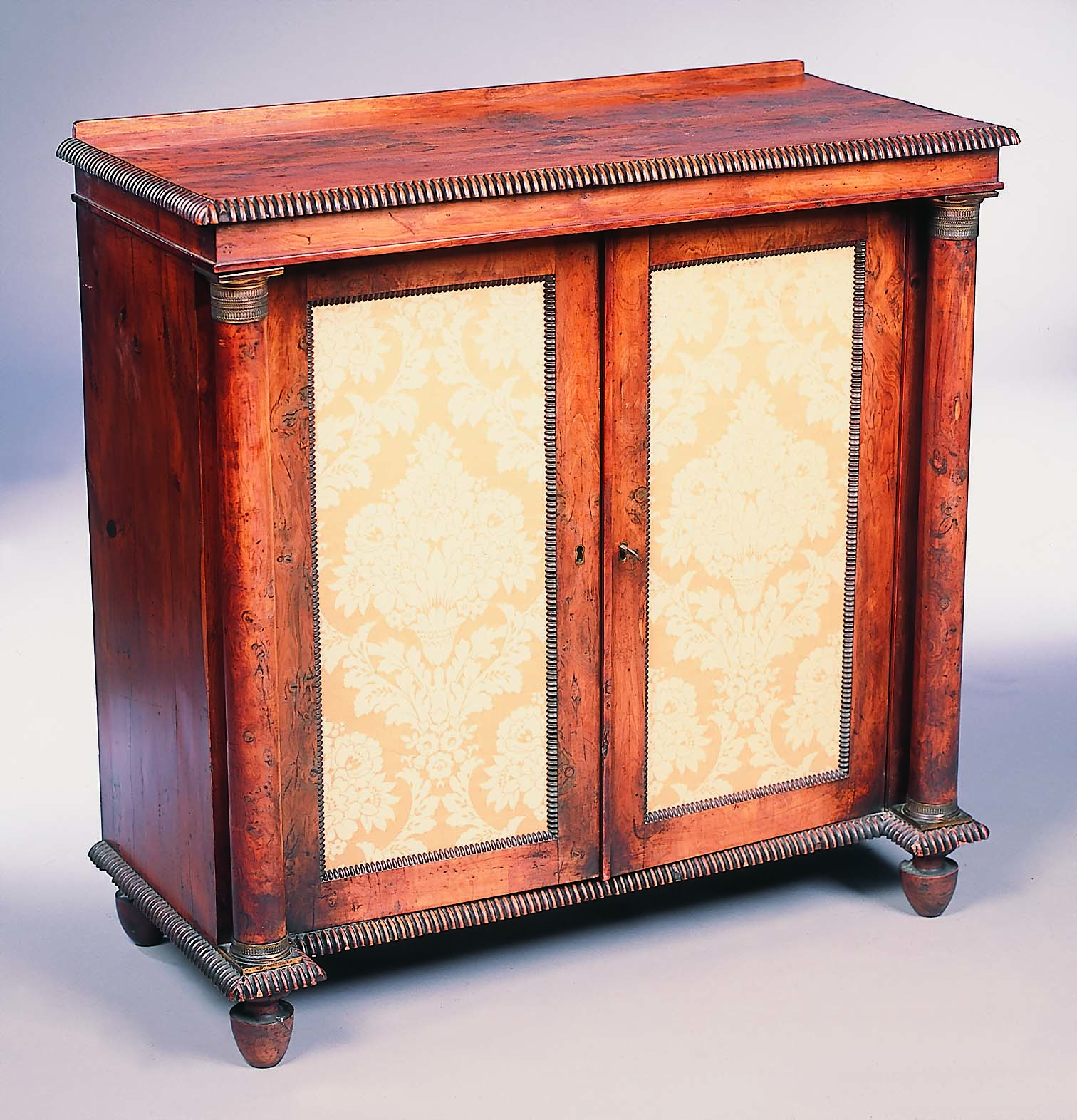 the rectangular top with ledge back and reeded edge above frieze and pair of doors with fabric panels enclosing shelved interior flanked by columns with brass capitals and bases, on plinth and turned feet with castors