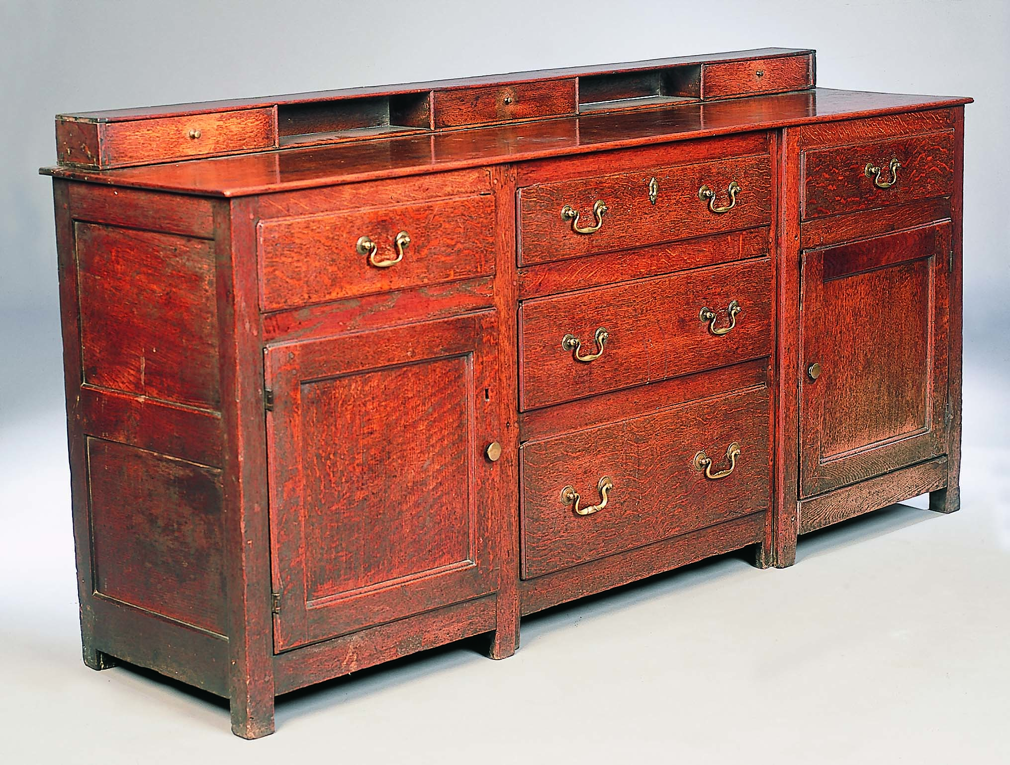 the rectangular projecting top with associated spice rack, above three graduated central drawers flanked projecting drawers and cupboards raised on stile feet