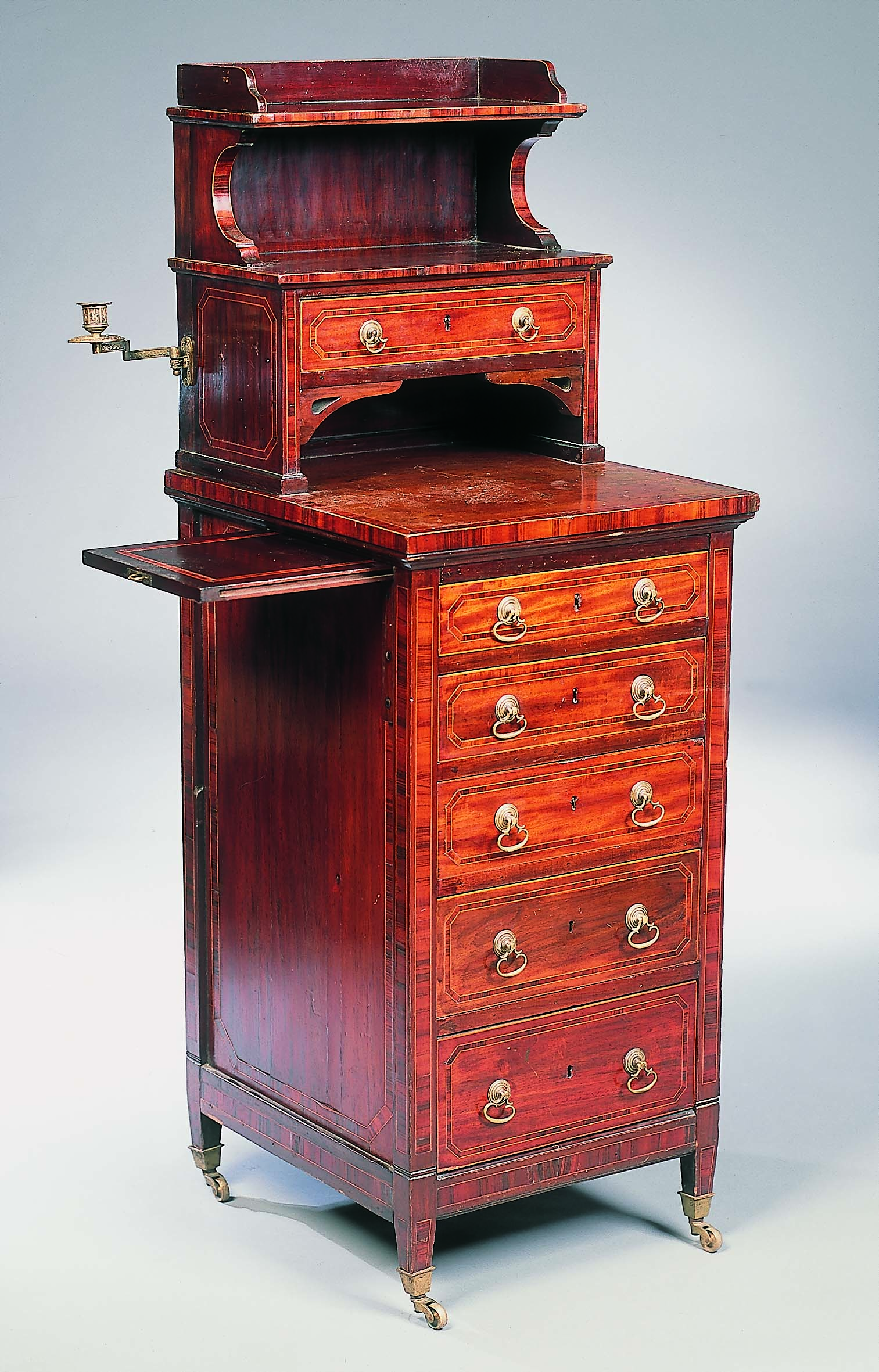 with rosewood cross banding and boxwood stringing, the two tier galleried super structure with one drawer and hinged brass candle arm to one side, the base with sliding rest to one side and five graduated drawers on tapering feet with brass caps and castors