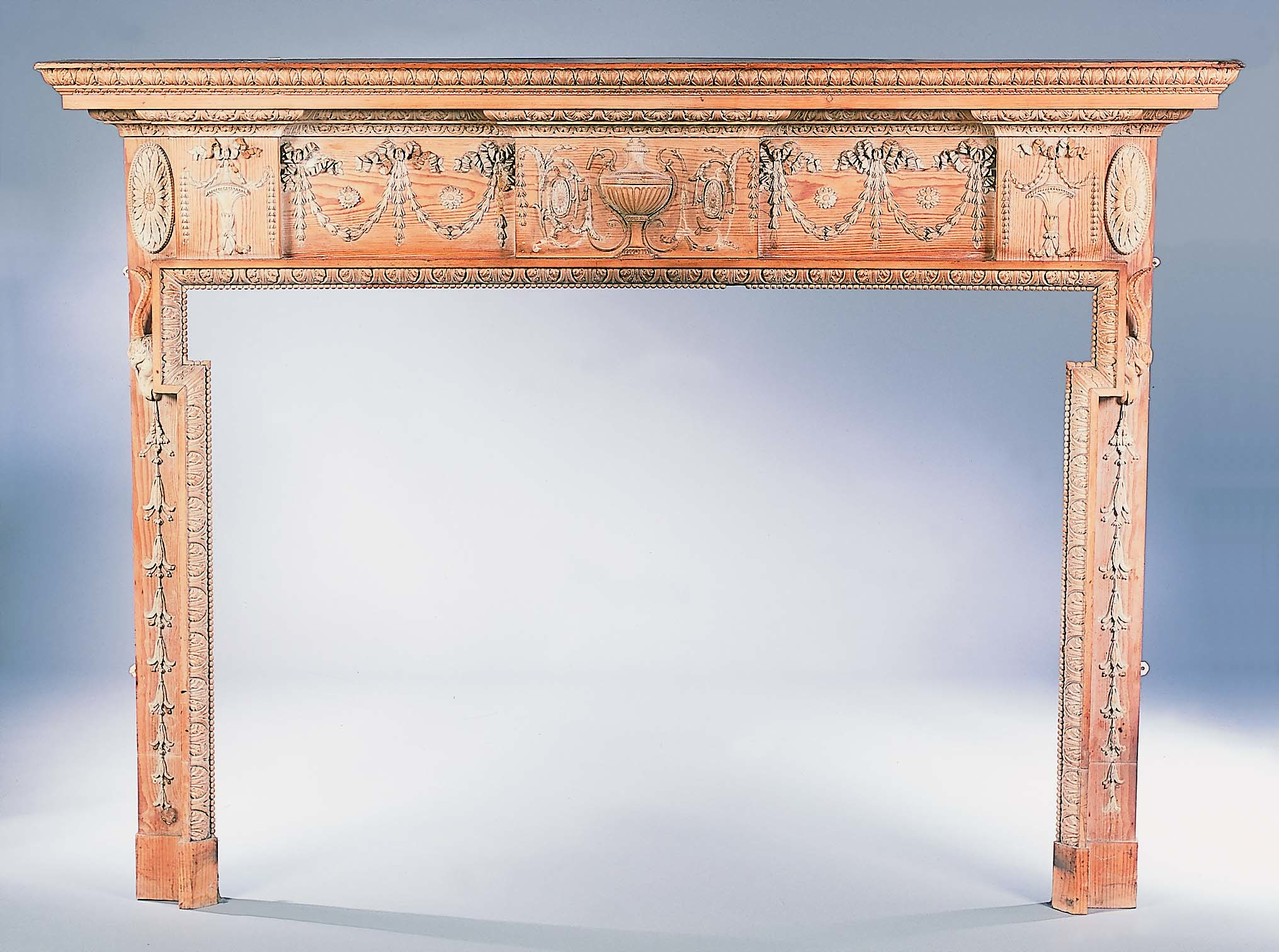 the moulded and leaf carved cornice above breakfront frieze with ribbon tied husk swags, rosettes and tablets with runs, the moulded lugged fire surround flanked by uprights with husk drops and ram's head terminals
