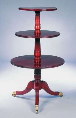 the concentric circular tiers with reeded edges, supported by turned columns and tripod legs with square section sabre legs and leaf cast brass caps and castors