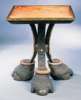 made from the hide and skin of a rhino, the square top with brass edged glass cover, laid on wooden base above three curved supports terminating in three feet