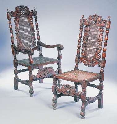 including two larger open armchairs, each with tall back centred by carved panel with scrolling frame and thistles, the top rail carved with crown flanked by thistles and framed by baluster and blocked uprights, with further thistles and finials, the spreading carved seat with relief carved rails raised on leaf carved scrolled legs joined by scrolled crown and thistle apron and turned and blocked H-stretcher (6)