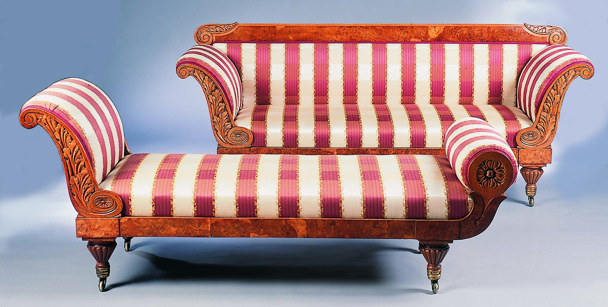en suite with the previous lot, the taller outscrolled end with oak leaf carved opposing uprights, the foot with opposing rosette terminals issuing from lappet clasp on sharply tapering turned and reeded legs terminating in brass caps and castors