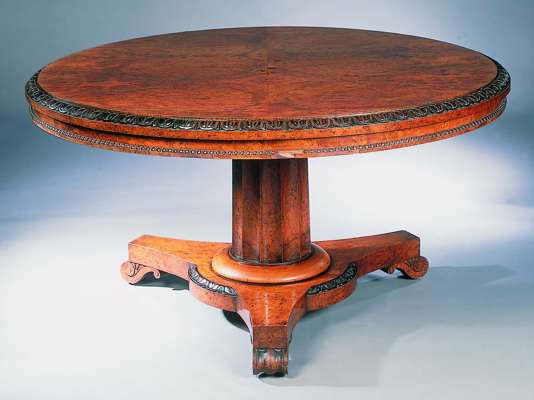 Note: This table displays various particular characteristics of William Trotter, notably the common sunken bead and reel moulding to the frieze, a variety of Grecian moulding to the rim, and particularly the scroll feet. The latter in particular can be compared with the scroll feet used on the magnificent circular table in the Signet Library, Edinburgh, supplied by Trotter in 1820 for the Faculty of Advocates. This rests on a massive panelled central column and cost the equally massive sum of £57 10/.