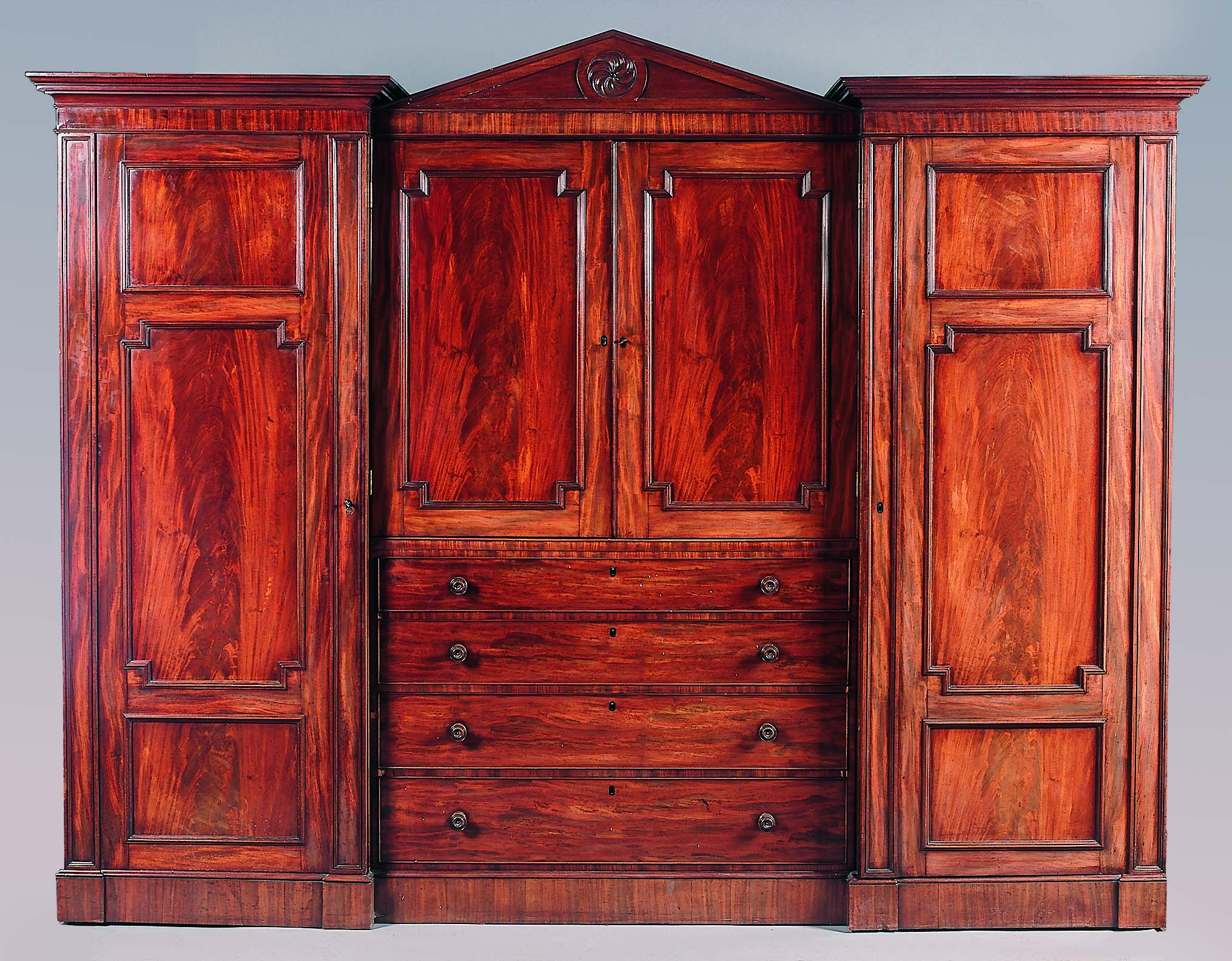 the moulded cornice centred by a pediment above pair of panelled doors at centre enclosing sliding trays with four graduated drawers below, flanked by full length panelled and pilastered doors enclosing hanging and drawers on plinth base