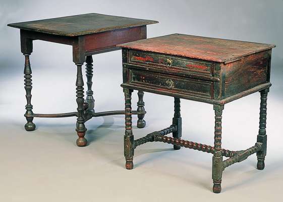 the rectangular top above two moulded and panelled drawers raised on bobbin turned and blocked legs linked by bobbin turned and blocked stretchers