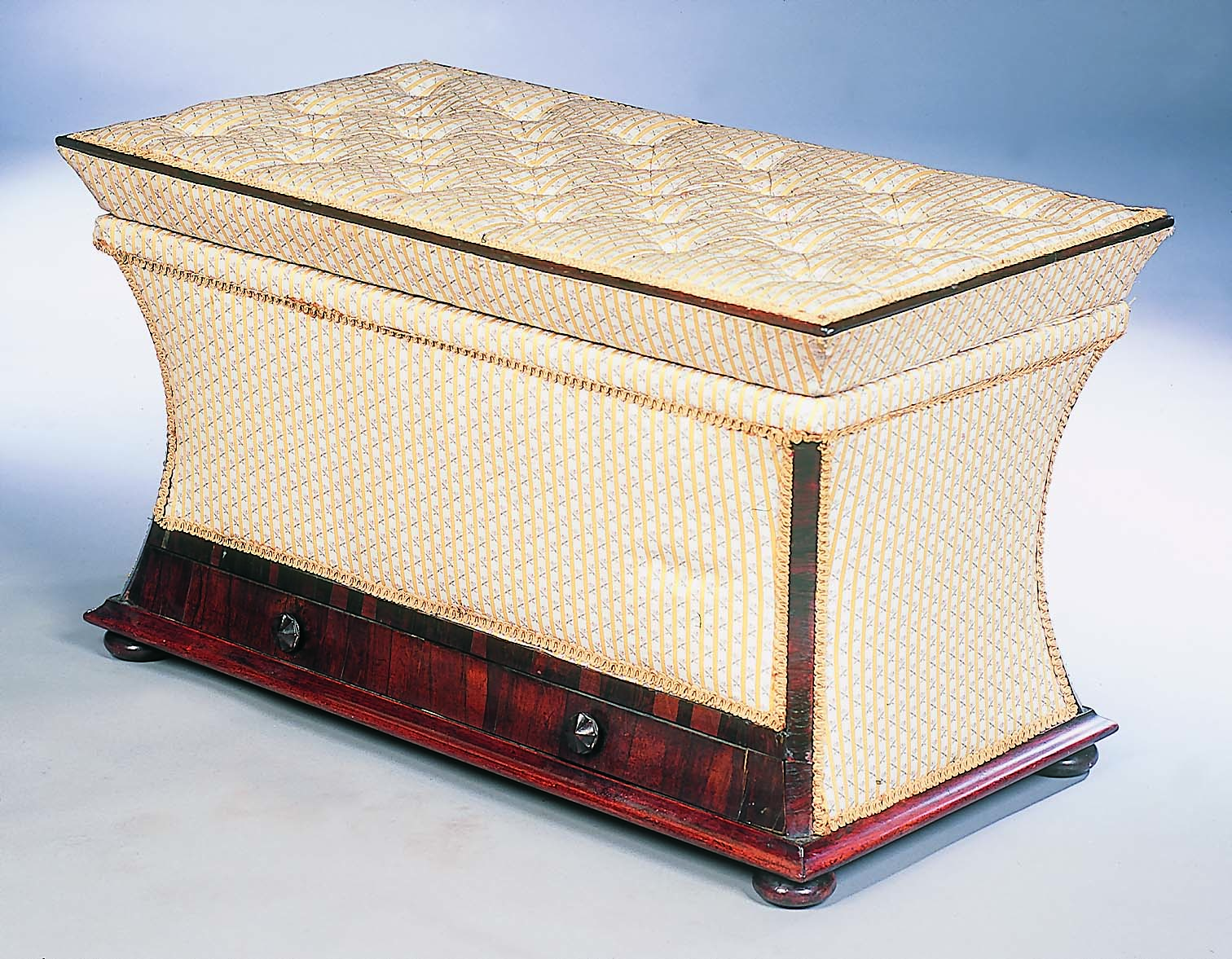 the rectangular hinged lid with button upholstery enclosing a padded and lined interior, the waisted sides above a lower drawer with moulded base raised above turned and flattened bun feet