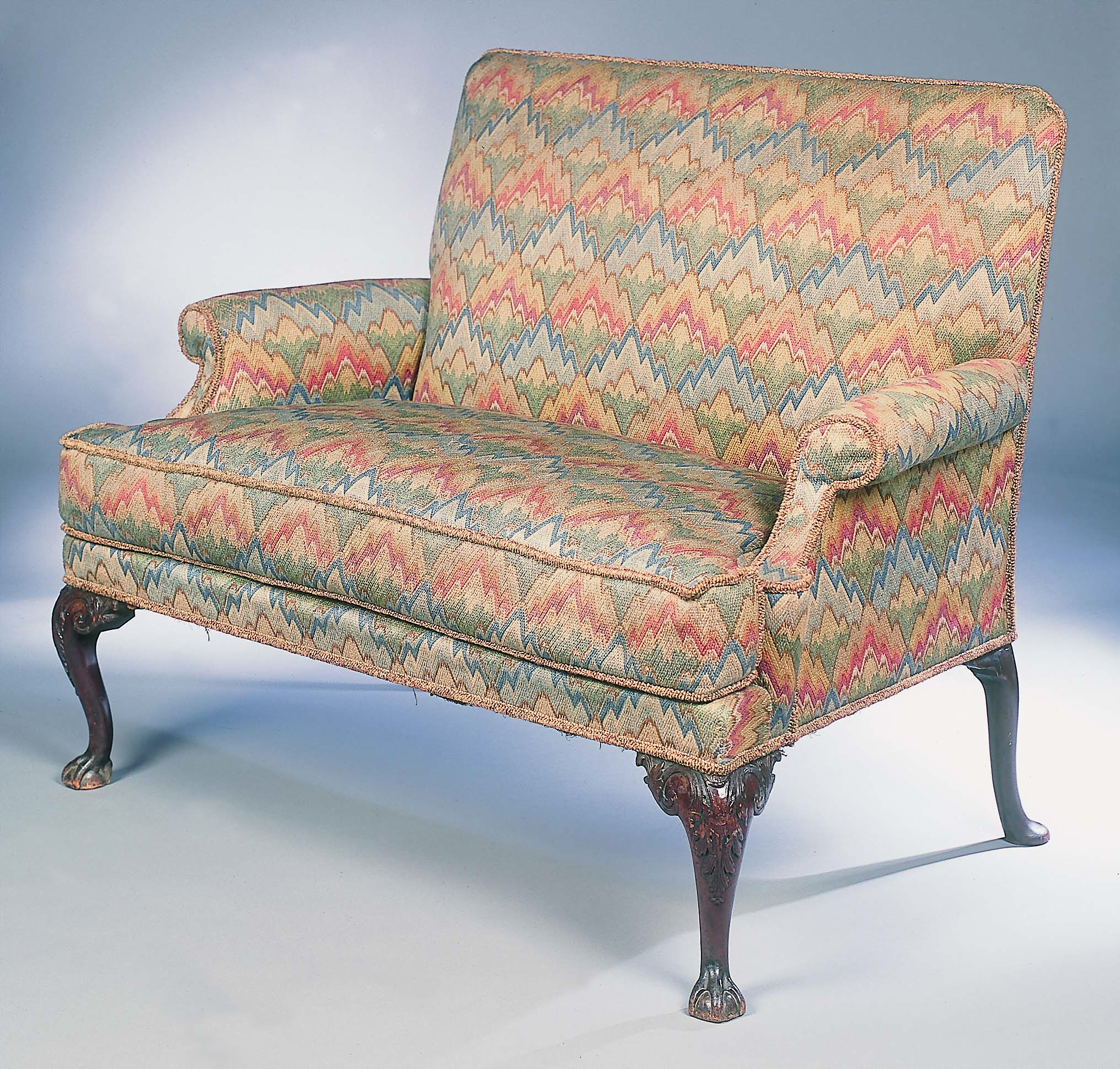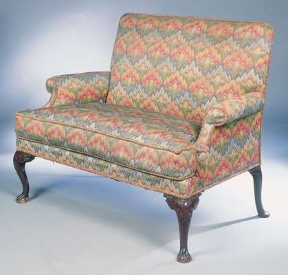 of generous proportions, the woolwork upholstered square back and outscrolled arms above seat with separate squab and leaf carved mahogany cabriole legs with ball and claw feet