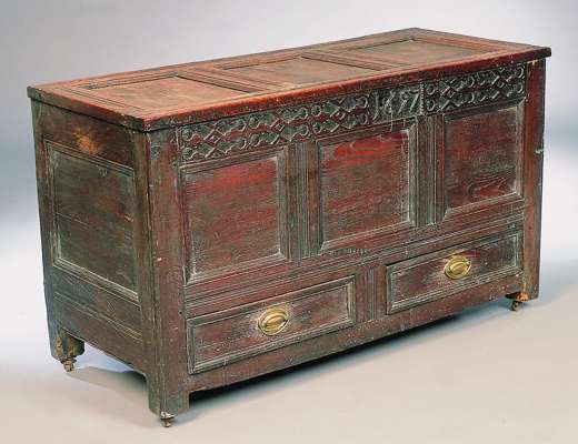 the hinged rectangular three panel top above strapwork frieze dated 1697 and three panel front with two lower drawers on stile feet