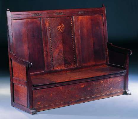 Note: The settle and chest offered for sale were designed by Robert Lorimer for his sister Janet. They constitute part of a group of furniture designed by Lorimer in a self-consciously Arts and Crafts manner in the last decade of the 19th century.