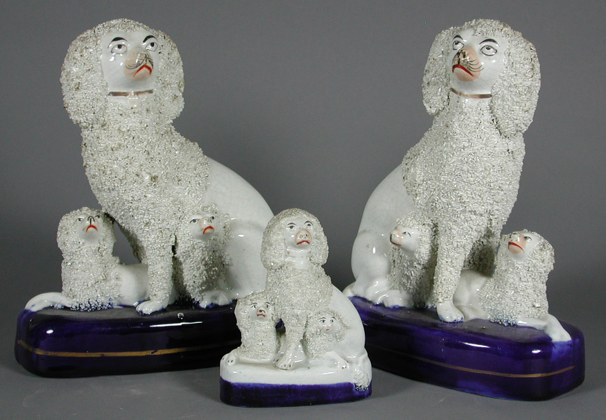 and two pups at their sides, on blue and gilt oval plinth, 20cm high, another similar miniature group, 10cm high (3)