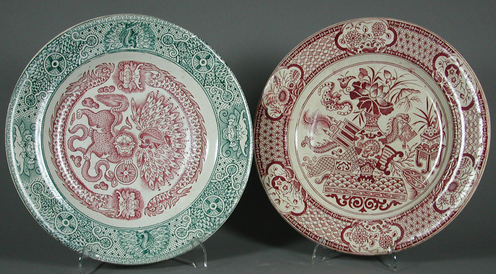 for the Eastern market, patterns 'Kwantung' in red, 'Kan China', 'McKassar' and 'Pekin' in red with green border, two smaller 'Singapore' lavender printed, another smaller '*** and Lilies' blue printed (6)