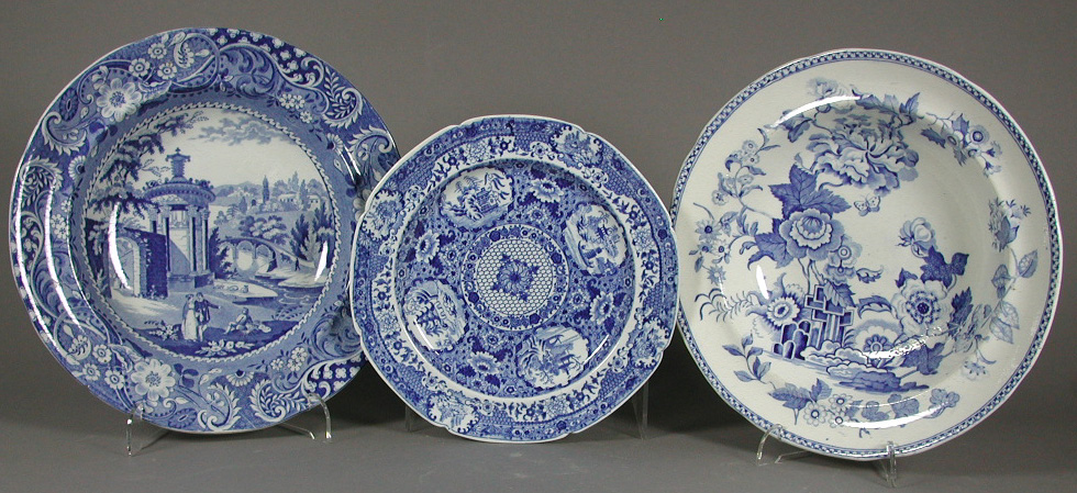 with chinoiserie decoration, three further similar plates, one with 'Beehive and Vases' pattern, three sideplates, one Riley, 'Girl Musicians' pattern, one Spode, another larger plate 'Semi Nankeen China', two soup bowls, one 'India Flowers', also one Elkin, Knight and Bridgwood 'Canton Views' stand (11)