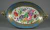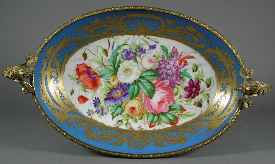 the central panel painted boldly with summer flowers, turquoise and gilt deep border, with ornate gilt brass swaggered frame on four scroll legs