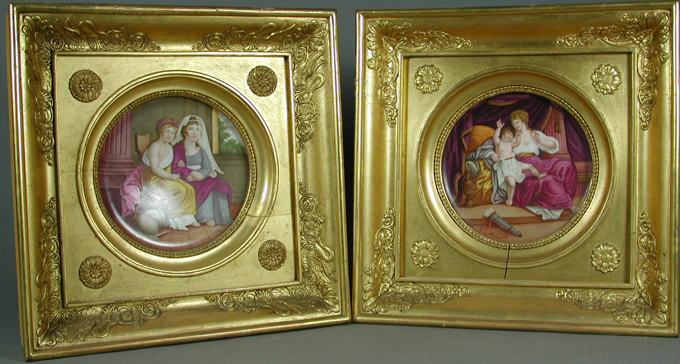 19th century, one with Diana and her young attendant in wooded glade, 17cm diameter, in rectangular giltwood frame with urn boss decoration; and another similar, the frame with flowerhead boss decoration (2)