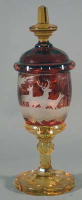 A late 19th century Bohemian ruby and amber glass goblet and cover