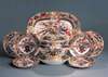 comprising twin handled soup tureen,cover and stand,with ornate rose and leaf cast finial painted in gilt and underglaze blue and rust with twin handled vase on stand issuing exuberant crysanthemum and other flowers with stylised flowerhead and leaf scroll border, the tureen with beaded stiff leaf cast frieze, (inner lid with chip ,and two long and two short hairlines, base with three minor chips and a hairline), 32cm, large rounded rectangular ashet (minor repaired rim chip and slight discolouration, 53cm wide ,another smaller, 41.5cm (minor glaze scratches], another smaller 31cm (minor glaze scratches] twenty one meat plates, 24cm (four with minor glaze scratches , six with staining, two with rim chips, one with rim hairline, two with hairlines )twelve soup plates, 25cm (two with rim hairline, three with rubbed gilt border, eight fish plates, 22.5cm (two with rim chips, one with minor glaze scratches, one with repaired crack)