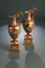 with ornate gilt scroll handle and spirally painted neck above opposed ovals depicting romantic 18th century figures between Greek Key and jewelled scroll decorated subsidiary panels, on square plinth with similar panels, blue beehive mark (2) (2 oval panels with minor surface scratches and some minor gilt loss to surround, 2 glaze chips)