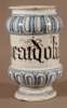 18th century, with narrow flared neck above bellied frieze painted with blue scrolls, similar footed base with central frieze painted in dark puce letters, 'El diaraidolir' (neck with 2 large and 2 small chips, chips and crazing to the foot and lower body)